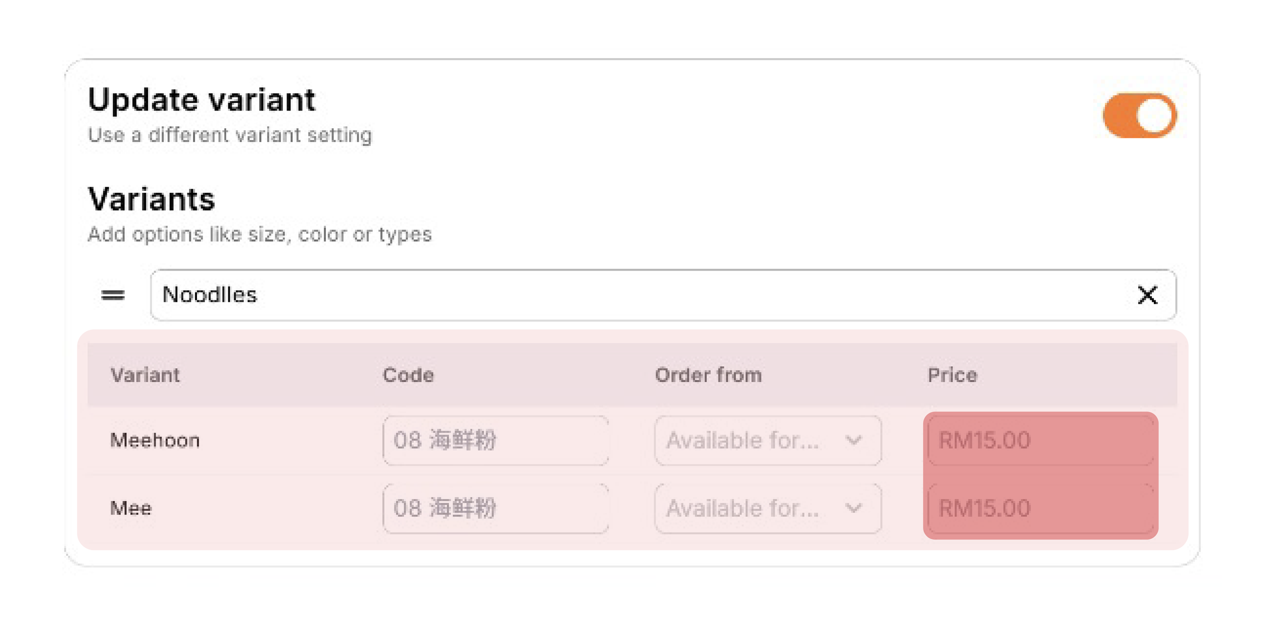Step 3: For example, you may want to have different variants of noodles. You may alter the prices of the variants, resulting in a different final price for the chosen product.
